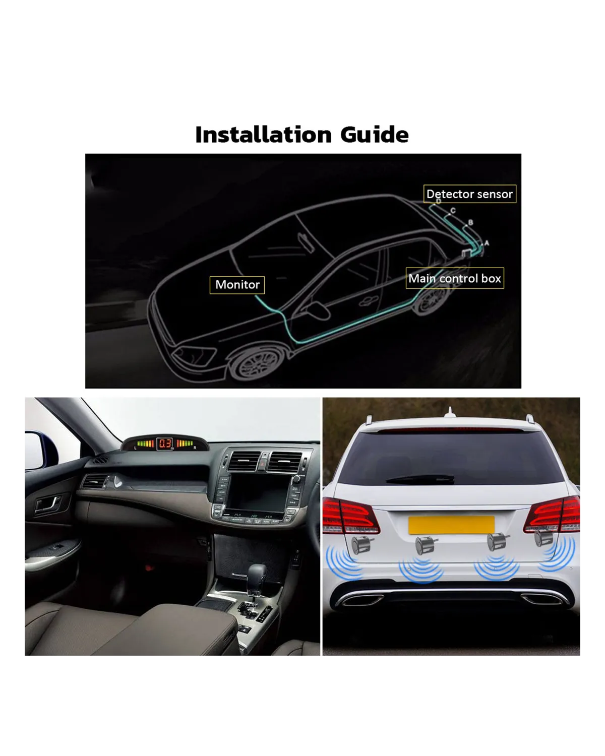 ● Reversing parking detector sensor and alarm system: with the vocal notification of beeping (will become more rapid with the distance becoming closer), install to prevent your car from corner colliding and impacting while reversing or parking. ● LED monitor: simply install it on the dashboard, it will show you the precise reversing distance, 7 light stripes display for orientation obstacles, see clearly even in the darkness ● Detector self-test function: abnormal status prompt, decrease the risk of detector damages.