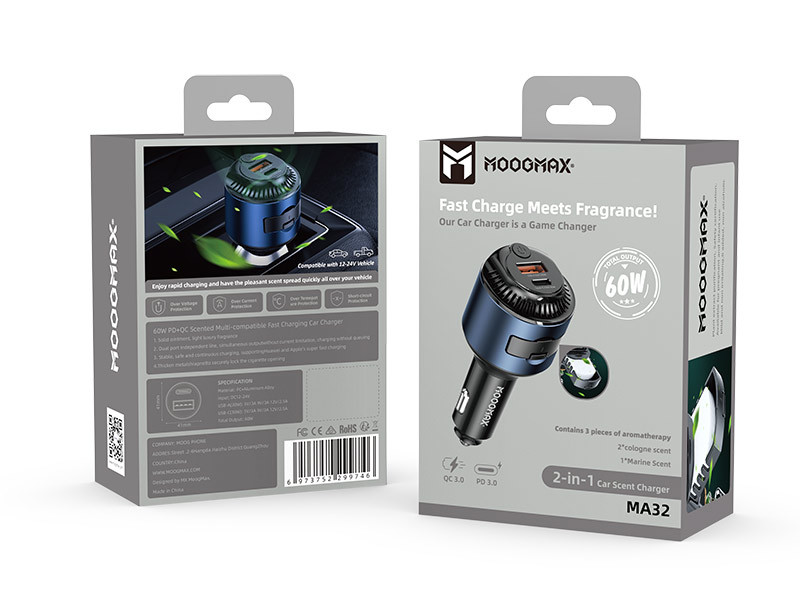 The MOOGMAX 2-in-1 Car Scent Charger MA32 is a game-changing accessory for your vehicle. With a powerful 60W output, it supports Quick Charge 3.0 and Power Delivery 3.0, ensuring rapid charging for all your devices. Beyond just charging, this innovative car accessory features built-in aromatherapy, enhancing your driving experience with refreshing scents. It includes three aromatherapy capsules (two Cologne and one Marine scent) to keep your car smelling fresh. Designed for universal compatibility with 12V/24V vehicles, this charger blends functionality, speed, and style in one compact design.